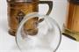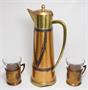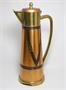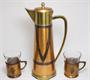 Půvabná nápojová souprava z období Belle Époque, stylově čistá geometrická secese, kombinace měděného, mosazného plechu a skla. Vysoká elegantní konvice s tlačeným ornamentem téměř na celé ploše. Vespod značeno výrobcem G.B.N. Bavaria ( Gebrüder Bing Nürnberg ), firma která byla známá především výrobou plechových a mechanických hraček. Žáruvzdorné sklenice jsou francouzské značky Duralex. Krásná uměleckořemeslná práce z počátku minulého století ve velmi dobrém stavu. Rozměr - konvice v. 33 x 17 x 12cm, skleničky v. 10,5 x 10 x 8cm