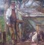 Olej na plátně 22,5 x 28,5 cm. Signováno vpravo dole monogramem a celým jménem vzadu na přeloženém plátně. Ústřední motiv staršího muže v klobouku krmícího z ošatky slepice. Původní stav obrazu. Originální zlatý rám s reliéfním ornamentem vavřínových listů, spodní hrana zespodu mírně poškozená. Anglie 1880 - 1910. Celkový rozměr s rámem 32,5 x 38,5 cm.