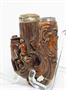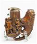 Velmi bohatě vyřezávaná hlavička dýmky z poloviny 19. století s žertovným motivem muže v kadibudce, lidiček čekajících ve frontě, psíka a opice. Drobná mistrovská řezbářská práce, téměř 200 let stará z tvrdého dřeva s mosazným poklopem. Chybí dvířka od kadibudky, spodní část je lepená a na hlavici dýmky prasklinka. Jinak stav viz foto, rozměr v. 11 x 11 x 5,5cm