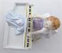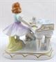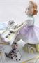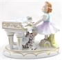 Bílý, barevný, malovaný a zlacený porcelán. Sitzendorfer Porzellanmanufaktur. Porcelánové sousoší sedící holčičky v sukni hrající na piano. V přední části pod pianem sedící vyjící teriér. Trojúhelníkovitý nepravidelný podstavec zdobený zlatými linkami. Značeno zespodu : modré písmeno S. s korunou, vtlačené číslo 2, psané číslo malíře 28. Německo od roku 1918.Výška 10 cm, šířka 13 cm.