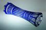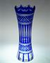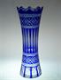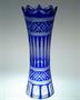Bohatě broušená prvotřídní velká váza z vrstveného kobaltově modrého skla na čirém jádru. Velmi precizně probrušovaný geometrický ornamentem na celé ploše vázy a parádně zakončené hrdlo do tvaru královské korunky a vespod broušená hvězdice. Pravděpodobně práce z druhé poloviny 19. století, provedly sklárny v severních Čechách, nebo na Šumavě. Dobrý stav, rozměr v. 35cm, prům. 13cm