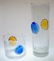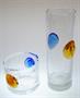 Autorské hutní sklo - váza a mísa z čirého skla s dekorem zatavených jemných bublinek a dvěma nálepy z barevného ( amber a akvamarínového ) skla, které na povrchu imitují polodrahokamy a také organicky tvarovaným hrdlem. Tato kolekce skla je dílem sklářského výtvarníka - Oldřich LÍPA ( *1929 ), studium u J. Kaplického, jeho tvorba je zastoupena v mnoha našich i světových sbírkách. Provedla sklárna MOSER Karlovy Vary kolem roku 1970. Dobrý stav, rozměr - v. 28cm, prům. 11cm a v. 11cm, prům. 15cm
