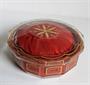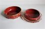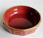 Dvanáctiboká dóza s víkem. Čiré sklo podjímané červeným mramorovaným hyalitem (tzv. Rotwelschglas), broušené, zlacené. Sklo této barvy doloženo v Novosvětské sklárně již v roce 1794. V roce 1817 použili tuto sklovinu Lorenz Tietzmann a Franz Tietzmann pro jejich stříbrem impregnované číše. 1828 zavedla novosvětská huť výrobu skla vrstveného rubínem. O vrstvení hyalitem není zpráva, jen zápis, že červeně vrstvené sklo a sklo vlašské červeně je používáno k rafinování lithyalinového skla, oba druhy surového skla přicházejí do brusírny, od brusičů jsou pak předány malířům, kteří je vlastnoručně připravenými barvami (Aetzfarben) impregnují [SOA Zámrsk, Fond VS Jilemnice, kn. 489]. Červeně mramorovaný hyalit zavedla do výroby kol 1822 také sklárna v Jiříkově Údolí hraběte Buquoye. Výška 3,5 cm, s víkem 5,5 cm, šířka 10,2, šířka víka 11 cm. Kol 1830. V hyalitu bubliny, na dně drobné rýhy.