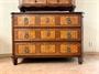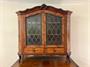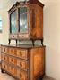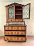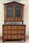 Historická komoda sestává ze dvou částí: empírový SPODNÍ DÍL z poloviny 19. století s původním kováním, zdobený intarziemi a NÁSTAVEC z období pozdního baroka, kování a madla na šuplících novější a chybí zámeček. Vitráže jsou také pozdější, pravděpodobně z počátku 20. století. Komoda je v bytovém stavu, stačí umýt a ošetřit polishem. Rozměry: komoda – šířka 124 cm, hloubka 64 cm a výška 89 cm, nástavec – šířka 115 cm, hloubka 41 cm a výška 118 cm. Komoda pochází z Valdštejnska pod Bezdězem.