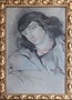 Pastel na papíru 48 cm x 32 cm. Signováno vpravo dole. Autor: Jan Dědina (1870-1955). Portrét mladíka s dlouhými vlnitými vlasy. V originálním zlatém rámu s reliéfními secesními ornamenty a se sklem. Čechy 1895 - 1915. Celkový rozměr s rámem 53 cm x 37 cm.