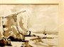 Doverské útesy od Jana Slavíčka, signováno vlevo dole, datováno 1937. Lavírovaná tuš na papíře s paspartou. Zaskleno a zarámováno. Rozměry (výřez pasparty) 36 x 49 cm. Rozměry s rámem 60 x 71 cm.