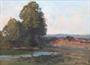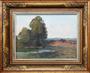 Olej na kartonu 25 cm x 35 cm. Autor: Jaromír Kunc (1900-1971). Signováno vpravo dole. Vzadu strojově psaný Ověřovací list s popisem obrazu a jeho názvem i jménem autora doplněný o výňatek z kulturní zprávy ze dne 25.3.1950 s popisem autora u příležitosti jeho výstavy k životnímu jubileu 50 let. Olejomalba krajiny se staveními v povzdálí za jednoho polojasného dne právě končícího léta. V originálním klenutém profilovaném patinovaném rámu s řezbovanými florálními ornamenty a sklem. Československo, kolem roku 1950. Celkový rozměr se sklem a rámem 38,5 cm x 48,5 cm.