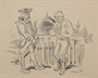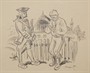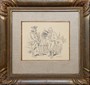 Kresba tuší na papíru 15 cm x 18 cm. Signováno vpravo dole s datací 1940. Autor: Jaroslav Vojna (1909-1974) se oženil s vnučkou slavného malíře Mikoláše Alše. Jeho kresby technikou a provedením připomínají Alšovu tvorbu. Císařský voják oslovující potencionálního rekruta před venkovskou chalupou. V originální rámu s tmavou zlatavou patinou a řezbovanými rohy. Čechy, rok 1940. Celkový rozměr s rámem 32 cm x 34 cm.