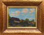 Olej na kartonu 25 cm x 34 cm. Signováno vpravo dole s datací 1921. Autor: Josef Tesař (1898-1953). Impresionistická olejomalba malých stavení rozložených ve stráni za polojasného letního dne. V širokém reliéfním zlatém rámu. Československo, rok 1921. Celkový rozměr 41 cm x 50 cm.