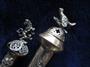 Judaika - 2 x stříbrný Jad - ukazovátko na tóru. Oba kusy jsou z druhé poloviny 19. století. Pochází z Carského Ruska. Delší je skutečně dlouhý - 31,5 cm, na vrchu rukojeti je propracovaná figurka tetřeva, zbytek rukojeti je zdobený ornamenty a vsazeným přírodním ametystem, zbytek ukazovátka je omotán stříbrným stočeným drátkem a ozdobený Davidovou hvězdou, zakončený malou rukou sevřenou v pěst s nataženým ukazováčkem. Kratší Jad má délku 17,5 cm, na vrchu rukojeti je propracovaná figurka lva, zbytek rukojeti je zdobený dalším lvem, Davidovou hvězdou a vsazeným přírodním korálem, zbytek ukazovátka je omotán stříbrným stočeným drátkem a zakončený malou rukou sevřenou v pěst s nataženým ukazováčkem. Oba kusy jsou značené Carským puncem, značkou zlatníka, puncem ryzosti - 84 zolotníků (ryzost 840/1000) a datací výroby 1873 (delší) a 1894 (kratší). Oba kusy jsou v krásně zachovalém stavu, nečištěné s původní patinou. Celková váha 64 g. Nádherné obohacení sbírky náročného sběratele.
