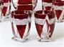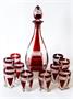 Stará art deco souprava, vysoká karafa a 10 skleniček na likér z lisovaného sklo zušlechtěného brusem, červenou lazurou a kaménkovým brusem (Steinelschliff), Československo kolem r. 1930, původní nálepka firmy Josef Inwald na karafě a leptaná značka Importé de Tchécoslovaquie zespodu na skleničkách. Výška karafy 31,5 cm, skleniček 7,2 cm, velmi dobrý stav bez poškození, zátka karafy sedí pevně, nepodařilo se bez triků uvolnit, jedna sklenička s minimálními oťuky na dolní hraně, běžné známky stáří a používání. Firma Inwald se sídlem v Praze vlastnila sklárny v Dobroníně / Deutsch-Schützendorf, Poděbradech, Zlíchově u Prahy, Bystřici / Wistritz, Rudolfova Huť v Dubí / Zuckmantel-Rudolfshütte a ve Florisdorfu u Vídně. (648)