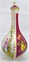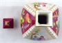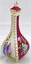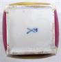 Bílý, barevně ručně malovaný a zlacený porcelán. V rokokovém stylu. Sachsisch Porzellanfabrik Potschappel von Carl Thieme, založeno roku 1872. Kónická karafa s úzkým čtvercovým hrdlem a odnímatelnou zátkou. Zdobená ručně malovanými galantními postavami v krajině a barevnými květinami na karmínově červeném pozadí. Zlacený rokokový ornament. Značeno zespodu: modrý kříž s písmenem T, vtlačená čísla. Německo, Potschappel 1872 - 1900. Výška 28 cm, šířka 12 cm, hloubka 12 cm.