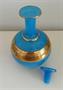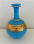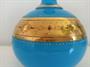 Karafa, sklo tyrkysové, zlacený pás se stylizovaným dekorem, zlacené linky, kulovitý tvar s válcovým hrdlem a víčkem, kolem poloviny 19. století, Čechy, výška 18,5 cm