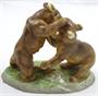 Barevná majolika. Autor modelu: Rudolf Chocholka (1888-1958), název modelu: Zwei spielende Bären, číslo modelu:1887. Keramos, Wiener Kunstkeramik und Porzellanmanufaktur. Barevné keramické figurální sousoší s motivem dvou stojících hnědých medvědů při hře. Oválný podstavec s reliéfním povrchem připomínající lesní mýtinu. Na podstavci originální zlatá papírová nálepka Wien Keramos. Značeno zespodu: černě Made in Austria Wien Keramos, vtlačené číslo modelu 1887. Rakousko od roku 1949. Výška 22 cm, šířka 26 cm.