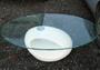 Starší masivní a těžký (jeden člověk taktak unese) konferenční stolek s tlustou skleněnou deskou s profilově broušeným okrajem, materiál mírně excentrické nohy neznám a neumím určit, pevně dohromady sešroubováno (viz foto). Patrně německý výrobce, podle techniky poslední čtvrtina 20 století. Výška circa 40 cm, deska 110 x 70 x 1 cm, dobrý stav bez poškození, běžné známky stáří a používání.