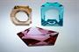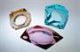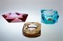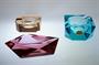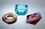 Masivní do mnoha hran celoplošně fazetově broušené a leštěné sklo v různých tvarech a odstínech - konvolut popelníků z druhé poloviny minulého století. Krásně barevné sklo v provedení topas, rosalin a beryl. Dochované původní nálepky ze skláren v severních Čechách. Dobrý stav, rozměr š. 15cm, 13cm a 9cm