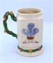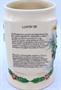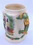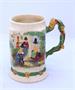 Malovaná keramika se světle žlutou glazurou. Ve spodní části zabudovaný hrací strojek s melodií. Na čelní straně text ve velštině : Llwyn On. Na jedné straně figurální barevný reliéfní motiv. Na druhé straně reliéfní koruna s chocholem a stuhou s nápisem : Ich Dien. Spodní barevný reliéfní vavřínový a květinový věneček - úchyt ve florálním stylu. Značeno zespodu : Crown Devon Fieldings, Made in England R N 812658. Crown Devon Fieldings, Stoke on Trent, Staffordshire, Anglie 1930 - 1940. Výška 16,5 cm.