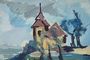 Krajinářské dílo příjemné barevnosti, navazující na tvorbu Václava Špály, kde autorka v díle kubisticky rozbíjí realitu. Motiv venkovského kostelíka se stromořadím na kopci ve velmi zdobném a reprezentativním rámu pod sklem. Sign. a dat. TICHÁ 1974, tempera na papíře. Autorka snad pochází ze slavné umělecké rodiny Tichých. Původní adjustace v dobrém stavu, rozměr rámu - 52 x 42cm, rozměr díla - 44 x 34cm