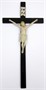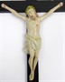 Dřevořezba, polychromie, patinováno. Přiloženo osvědčení Národního památkového ústavu České republiky. Vysoký krucifix se z běžného pojetí vymyká umístěním titulu s písmeny IN/PJ. Hlava Ježíše s velmi drobným tělem je skloněná k pravému rameni a rána umístěna vlevo na hrudi je vyznačena červeně. Bederní rouška (perizonium) krémové barevnosti je uvázána na pravém boku. Dřevěný kříž černé barvy je lakovaný. Nahoře na zadní straně kříže oko na závěs. Střední Evropa 1900 - 1940. Výška 65 cm.