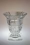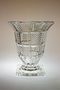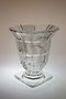 Stylová váza otevřeného tvaru stojící na patce z masivního čirého skla dekorovaná kubistickým šachovnicovým ornamentem, který má hluboký reliéf. Luxusní objekt - váza je vespod značená TSCHECOSLOV. ( pravděpodobně určená pro export ). Pochází z první třetiny minulého století, provedly krystalerie v severních Čechách. Dobrý stav, rozměr - v. 20,5cm, prům. 18cm
