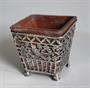 Stříbrný obal s prořezávaným orientalizujícím dekorem, Ag 800/1000, úřední čsl. punc pro dovezené zboží lilie s písmenem Č, od 1921. Terakotová vložka silně poškozená, slepovaná. Výrobce: zahraniční továrna stříbrného zboží, značka M M v oválu. Váha brutto 84,5 gr. Výška 4,5 cm, strany 5x5 cm.