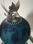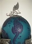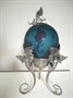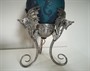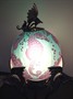 Stolní lampa se širmem ze světlemodrého přejímaného skla s mořskými motivy, podstavec je kovový (cín).Výška je 43 cm, šířka 22 cm. Autor Zelenka