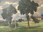 Obraz s motivem krajiny se stavením od německo-české malířky Lili Gödlové-Brandhuberové. Přednímu plánu dominují dva vzrostlé listnaté stromy, při pravé straně v dálnějším zvýšeném terénu se nachází za osvětlenou louku hospodářské stavení, levá strana zachycuje hlubší pohled do krajiny v popředí s křovím a břízkou. Expresivnější technika s lehkým impresionistickým laděním klade umírněně pozornost na světelnou hru patrnou zejména v pastvině, korunách stromů a dramatické obloze, díky věrohodnému zachycení denního světla se autorce podařil vytvořit klidný dojem s jistou mírou dějovosti. Barevná paleta využívá převážně zemitějších zelených a modrých tónů zpestřených bílou a hnědou.