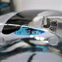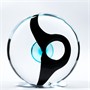 unikát, autorská práce 80. let italského sklářského výtvarníka Livio Seguso (1930), značeno zespodu „STUDIO / SEGUSO ARTE VETRO“, původní nálepka sklárny, výška 22,5 cm, masivní provedení z čirého skla s modrým centrem a nálepem z černého opálu, zepředu v centru ploše broušeno.
