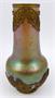 Sklo matně irisované foukané do formy, bronzová montáž. Světoznámá sklárna Loetz Witwe, Klášterský Mlýn (Klostermühle). Dekor: Candia Silberiris. Secesní váza s dekorem Candia Silberiris s kulovitou podstavou a k hrdlu zužujícím se válcovitým tělem. S bronzovou montáží v dolní i horní části se secesními prořezávanými ornamenty v podobě motýlů, jejichž křídla jsou zdobena cizokrajnými květy. Čechy, Klášterský Mlýn (Klostermühle), kolem roku 1904. Výška 25,5 cm.