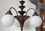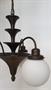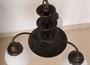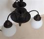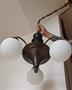 Zachovalý lustr art deco, kovová konstrukce a elektrifikace původní, ale funkční. Tři skleněné koule dokoupeny nově. Rozpětí cca 50 cm, výška lustru bez řetězu cca 50 cm, celková výška i s řetězem 105 cm.