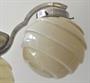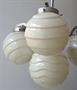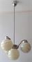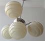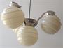 Niklovaný obecný kov, žluté sklo. Klenutá stropnice, úzká tyč, horní část lustru, ramena - z bílého kovu. Horní část miskovitého tvaru, s prstencem. Tři klenutá obloukovitě tvarovaná malá ramena. Kulaté úchyty na stínidla. Stínidla ve tvaru koule, ze žlutavého skla. Zdobené vodorovnými reliéfními linkami a vlnkami. Elektrifikovaný. Československo 1920 - 1940. Výška 95 cm, šířka 50 cm.