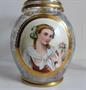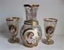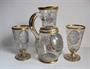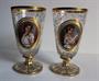 Džbán a dvě číše na noze. Čiré sklo s nataveným dvouvrstvým medalionem. Na sklenicí a džbánu transparentní malba květin a leštěné zlacení, na medailonech malba portrétů barevnými emaily, pod medailonem na džbánu vzduchová bublina (foto 5). Sklenice v. 15,5 cm, průměr 8.4 cm. Džbán v. 23,6 cm. Kol 1860. Lenora, Wilhelm Kralik (?).