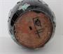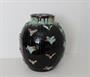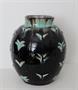 Majoliková váza soudkovitá, se zúženým hrdlem, červeného střepu s černou a tyrkysovou stékavou glazurou. Reliéfní dekor. Značeno na dně malovanou autorskou signaturou, přičtenou Lottě Fink, činnou kol 1920 pro Wiener Werkstätte. Výška 19,5 cm, průměr hrdla 8,5 cm. Drobný kaz u dna, viz foto značky. Kol 1930.