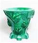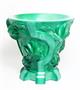 Vzácně vídané provedení masivní vázy z malachitového ( Jade ) skla s hlubokým květinovým reliéfem, stojící na stylové industriální patce. Matované, broušené a leštěné sklo ve výrazném tvarosloví Art - Deco provedla Jizerskohorská krystalerie Heinrich HOFFMANN po roce 1935, podle návrhu výtvarníka - Alexandr PFOHL (*1894 Nový Bor +1953 Hadamar). Součást kolekce luxusního skla Ingrid. Dobrý stav, rozměr - v. 16,5cm, prům. 18cm