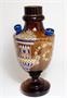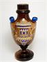 Velmi stará bohatě dekorovaná váza z topasového skla s kobaltově modrými nálepy, které jsou jako stylizovaná ouška, provedení z druhé poloviny 19. století. Váza elegantně stojící na patce, je zušlechtěná malbou vypalovaným smaltem s květinovým ornamentem. Krásná dobová práce sklářů, pravděpodobně provedly krystalerie v severních Čechách. Dobrý stav, rozměr - v. 26cm, prům. 13cm