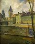 MANDEL JIŘÍ ML. – ZÁKOUTÍ U KARLOVA MOSTU. Olejomalba na plátně pod sklem, signováno vlevo dole Jiří Mandel ml. , rozměry 61x54 s rámem a 46x38 plátno. Obraz představuje Karlův most na Starém městě Pražském s Mosteckou věží.