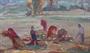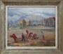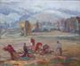 Olej na plátně 50 x 61 cm. Ženy vázající povříslem obilí do snopů na poli, s výhledem do kopcovité krajiny za mlžného dne. Signováno vpravo dole. Československo 1930 - 1945. Originální umělecký patinovaný rám s bílou vnitřní linkou. Celkový rozměr s rámem 65 x 76 cm.