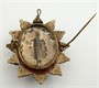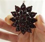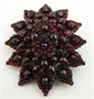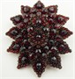 Tombak, přírodní ručně broušené české granáty, čiré sklo. Celková hmotnost 14,11 g. Závěsný otevírací medailon z tombaku zdobený pravými českými granáty, jenž se dá použít i jako brož (na spodní části jehla k uchycení). Medailon na závěs či brož z tombaku ve tvaru vrstvené hvězdy mírně oválného tvaru. Zdobeno velkými i malými přírodními českými granáty routového výbrusu. Na spodní části medailonu otevírací rámeček oválného tvaru krytý čirým sklem s prostorem pro podobenku či jiný předmět osobní vzpomínky. Čechy 1840 - 1880. Rozměr medailonu (brože): 45 mm x 40 mm.