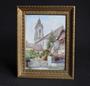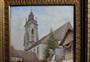 Miniaturní malba města s kostelem a přilehlými domy. Je provedena na destičce se strukturou slonové kosti. Vložena do bronzového zlaceného rámečku s opěrkou, pod sklem s prasklinou v rohu. Autor Carl Robert Rädler, malíř (1881-1945). Maloval také portréty a krajinné miniatury na slonovině. Malba signována C. RÄDLER., uvnitř rámečku razítkem CARL RÄDLER WIEN III Dapontegasse Nr. 10 ATELIER. Rozměry 16,9 x 13,4 cm. Kol 1930.