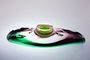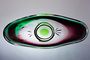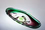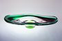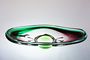 Překrásně barevná hutně zpracovaná mísa z ametystového skla se dvěma odstíny zeleného dekoru a to vše přejímané čirou sklovinou. Přehnutý okraj mísy s vtlačeným ornamentem vespod. Skvělá sklářská práce ze 60-70tých let, sklárna Ústředí uměleckých řemesel ve Škrdlovicích. Dobrý stav, rozměr - š. 38 x 16 x 8cm