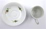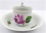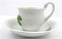 Bílý a ručně barevně malovaný porcelán. Období a styl: empír. Šálek z bílého porcelánu v empírovém tvaru se stylizovaným úchytem ve tvaru labutě. Šálek i podšálek ručně dekorovány květy růží s listy a úponky. Místy velmi drobné výrobní kazy na porcelánu. Značeno zespodu: značka výrobce platná pro uvedené období. Německo, Míšeň 1816 - 1830. Výška šálku 7,5 cm, průměr podšálku 14 cm.