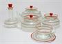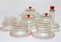 Čtyřosobní servis z čirého hutně foukaného jemného skla, které je zušlechtěné malovaným barevným dekorem a matováním. Autorem návrhu z první poloviny minulého století je pravděpodobně designér František KŘÍŽ, který navrhoval užitkové sklo pro uměleckořemeslné hnutí Krásná jizba. Modernistický lineární dekor možná není autorský, ale činí servis velmi neobvyklým. Souprava se skládá: Velká konvice, menší konvička, cukřenka, karafka, 4 šálky a 4 podšálky. Dobrý stav, rozměr - konvice v. 14cm, š. 23cm, šapo v. 6cm, prům. 13cm