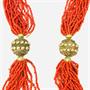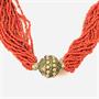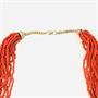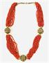 Extravagantní náhrdelník skládající se z 20 šňůr přírodního tmavě červeného (patrně barveného) mořského korálu, rozděleno velkými kulatými články zdobených perlovcem a filigránem. Výrazný, orientální šperk z poslední třetiny 20. století.