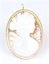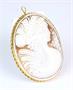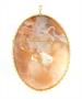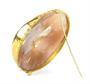 Kamej řezaná v mušlovině osazená ve zlatém rámečku. Šperk může být užíván jako brož i jako závěs. Vyrobeno ze zlata ryzosti 750/1000.