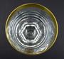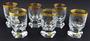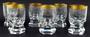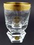 Bezbarvé broušené křišťálové sklo, zlacený leptaný pás s ornamenty. Připomínající vzor Dominik od Luboše Meteláka. Větší a menší sklenice z bezbarvého skla s masivní silnostěnnou podstavou. Horní okraj zdobený zlaceným leptaným reliéfním ornamentem v empírovém stylu. Masivní podstava s fazetami. Na čelní straně leptaný a zlacený státní znak ČSSR. Značeno zespodu: leptaná značka Moser v oválu. Československo 1965 - 1985. Výška 13 cm.