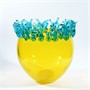 návrh 70./80. léta, provedení sklárna Barovier et Toso, značeno zespodu „Barovier / e Toso / Murano“ (používaná v letech 1971 až 1984), výška 24 cm, průměr 24 cm, žluté sklo s hutně aplikovanými modrozelenými nálepy na horním okraji.