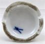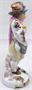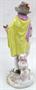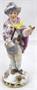 Bílý, barevně ručně malovaný a zlacený porcelán. V rokokovém stylu. Stojící muž ve žlutém plášti a šedivém klobouku držící v pravé ruce malého barevného ptáčka. Rokokově tvarovaný zlacený kulatý podstavec. Značeno zespodu: modré zkřížené linky a čísla. Anglie, Chelsea, 18. století - nebo Carl Teichert, Německo 1864 - 1880. Výška 16 cm, průměr podstavec 6 cm.