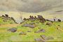 Krajina s jedinečnou atmosférou a figurální stafáží žence v hornaté krajině. Větší a velmi kvalitní krajinomalba na plátně od autora - Josef MAREŠ ( *1888 +1938 ) malíř převážně krajinář, studia v Mnichově spolu s přítelem J. Pruchou, tvořil a působil v okolí Chrudimi a Železných hor. Původní rám, sig. p.d. Dobrý stav. Celkový rozměr 80 x 60cm, rozměr díla - 69 x 49cm