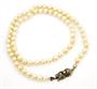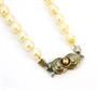 Náhrdelník z kultivovaných mořských perel krémové barvy o průměru 5,5 - 6 mm, navlékané z uzlíky. Stříbrný zdobný uzávěr ve tvaru spojených o ryzosti Ag 835 / 1000 Používaný stav, mírně opotřebené. Celková hmotnost 20,32 gramů. Délka 47 cm.