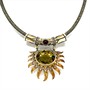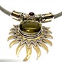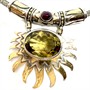 Výrazný, velmi originální, autorský stříbrný náhrdelník připomínající Slunce. Šperk tvoří náhrdelník zhotovený z kůže rejnoka a bohatě zdobený, odnímatelný závěs. Ten byl vyroben ze stříbra sterlingové ryzosti (925/1000) a je bohatě zdoben téměř ryzím zlatem. Šperk osazen velkým, fazetově broušeným citrínem oválného tvaru a muglí rubínu. Rozměry závěsu cca 5 x 4,5 cm. Osvědčení puncovního úřadu. Váha závěsu 35,19 g. Délka náhrdelníku 44 cm. Šperk se zapíná na silný magnet. Profesionálně vyčištěno, perfektní stav.
